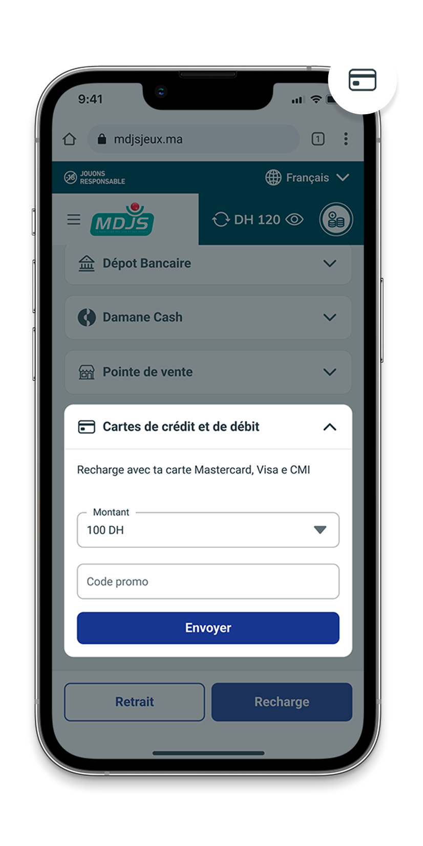 يمكنك تعبئة حساب اللعب الخاص بك بأمان باستخدام بطاقات الائتمان والخصم الخاصة بك، باستخدام بطاقات Mastercard وVISA وCMI.