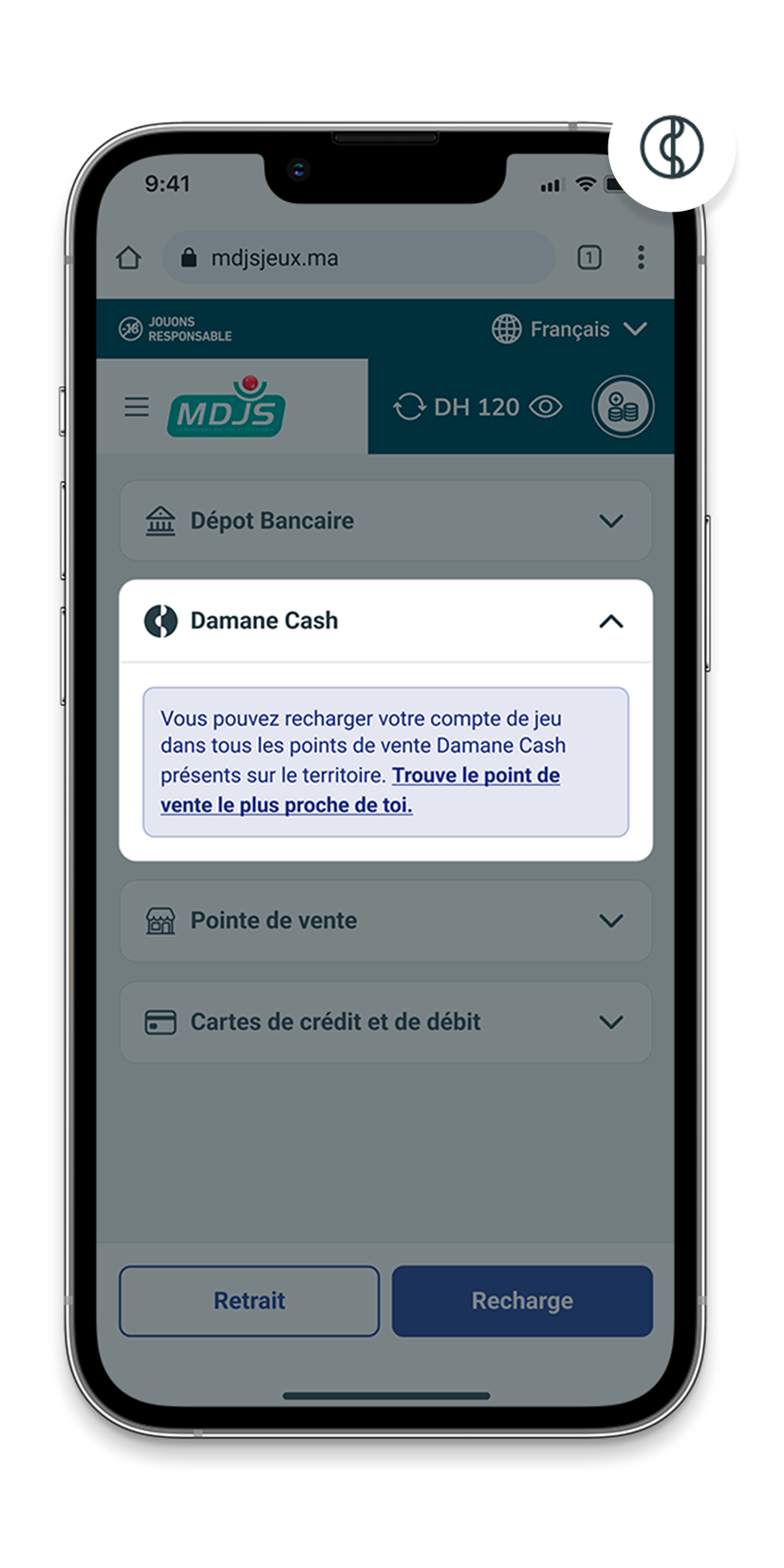 يمكنك تعبئة حساب الألعاب الخاص بك نقداً في أي نقطة بيع تابعة لشركة.الشركة المغربية للألعاب والرياضات